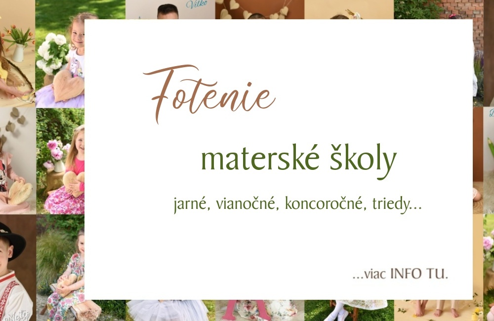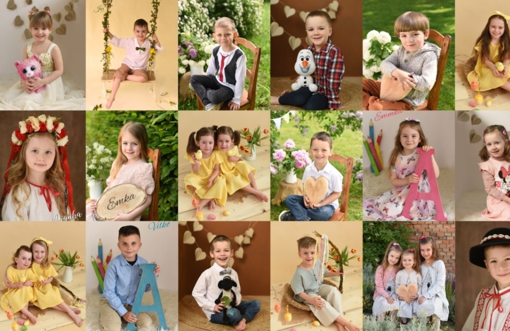 Okrem fotografovania rodín sa venujem aj fotografovaniu mojich obľúbených škôlkarov. S pani učiteľkami v materských školách v Trenčíne a okolí sa už dobre poznáme. Spoločne sa snažíme, aby škôlkarske fotenia bolo pre deti príjemným zážitkom. Každý rok na jar a na Vianoce vymýšlam niečo nové, čo by sa páčilo hlavne vám, rodičom.